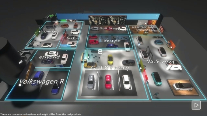 폭스바겐의 모든 차량들과 부스는 인터랙티브 디지털 방식으로 구현되어 방문객은 실제 모터쇼 현장에 방문한 듯 생생한 경험을 해볼 수 있다. 또한 360° 체험을 통해 전시된 차량들을 모든 측면에서 살펴 볼 수 있으며, 차량의 색상과 휠 구성을 직접 변경해 보는 등 적극적인 참여 역시 가능하다.
