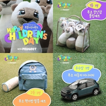 당첨자는 27일에 발표할 예정이며, 5월5일 어린이날 이전에 고객에게 배송한다. 경품은 푸조 어린이용 장난감 볼링 세트(1명)와 푸조 책가방 필통 세트(3명), 그리고 푸조 자동차 미니어처(3명)이다.