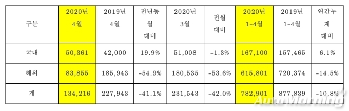 이는 전년 동기 대비 41.1% 감소한 수치다. 코로나19의 글로벌 확산으로 인해 해외 판매가 54.9% 줄었다. 다만 국내에선 19.9% 증가해 내수 호조를 이어갔다.