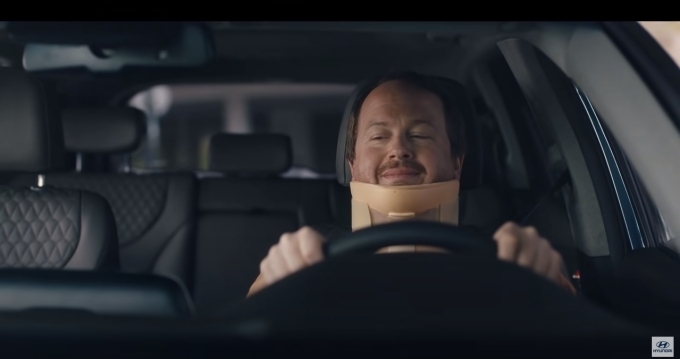 현대차의 ‘리어 뷰 모니터’ 광고에서는 목에 착용한 보호대 때문에 일상생활에 불편을 겪는 한 싼타페 운전자가 고개를 돌리는 대신 싼타페의 후방 카메라 기능만을 이용해 편리하게 주차하는 모습이 재치 있게 연출됐다.