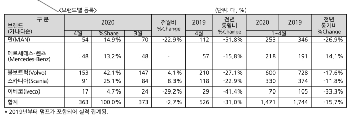 25일 수입자동차협회에 따르면 4월 상용차 브랜드별 등록대수는 만 54대, 메르세데스-벤츠 48대, 볼보트럭 153대, 스카니아 91대, 이베코 17대이다.