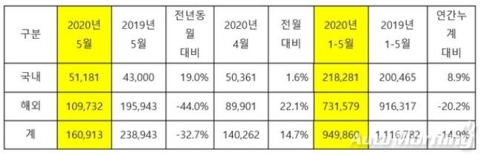 해외 판매는 신종 코로나바이러스 감염증(코로나19) 확산 영향으로 글로벌 시장의 소비 심리가 위축되고 딜러 판매 활동이 제약된 데다, 대부분의 해외 공장이 축소 가동되면서 크게 줄었다.