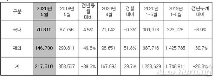 [오토모닝 정영창 기자] 현대차는 5월 국내 7만810대, 해외 14만6700대 등 전세계 시장에서 총 21만7510대를 판매했다고 1일 밝혔다.