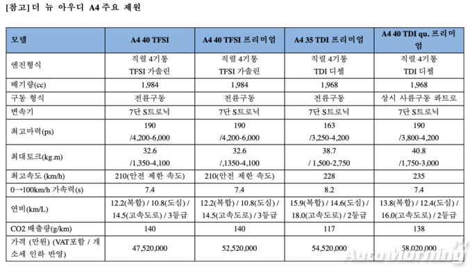 이번에 출시하는 더 뉴 아우디 A4는 5세대 부분변경 모델로 더 뉴 아우디 A4 40 TFSI, 더 뉴 아우디 A4 40 TFSI 프리미엄, 더 뉴 아우디 A4 35 TDI 프리미엄, 더 뉴 아우디 A4 40 TDI 콰트로 프리미엄 총 4가지 모델을 선보인다.
