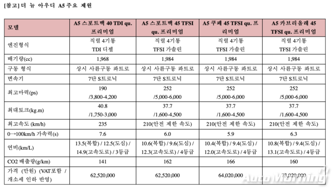 ‘더 뉴 아우디 A5 스포트백 40 TDI 콰트로 프리미엄’과 ‘더 뉴 아우디 A5 스포트백 45 TFSI 콰트로 프리미엄’ 가격은 6252만원, ‘더 뉴 아우디 A5 쿠페 45 TFSI 콰트로 프리미엄’ 가격은 6402만원, ‘더 뉴 아우디 A5 카브리올레 45 TFSI 콰트로 프리미엄’ 가격은 7302만원이다. (부가세 포함, 개별 소비세 인하 적용 기준)