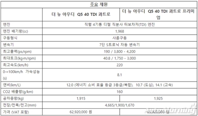 아우디 Q5 40 TDI 콰트로의 가격은 6292만원이고, 아우디 Q5 40 TDI 콰트로 프리미엄의 가격은 6592만원이다. (개별 소비세 인하 적용)
