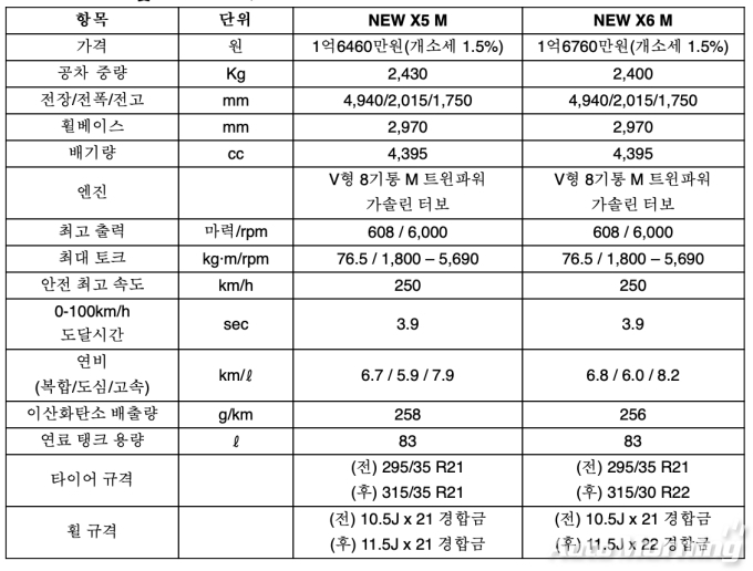 가격은 뉴 X5 M이 1억6460만원, 뉴 X6 M이 1억6760만원이다. (개별소비세 1.5% 적용 기준)