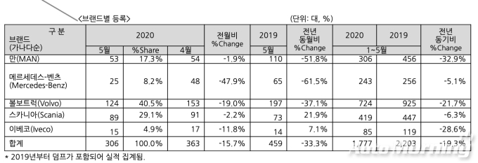 1-5월 누적판매대수는 1777대로 전년 동기대비 19.3% 감소했다. 5월 상용차 브랜드별 등록대수는 만(MAN) 53대, 메르세데스-벤츠(Mercedes-Benz) 25대, 볼보트럭(Volvo Trucks) 124대, 스카니아(Scania) 89대, 이베코(Iveco) 15대 순이다.