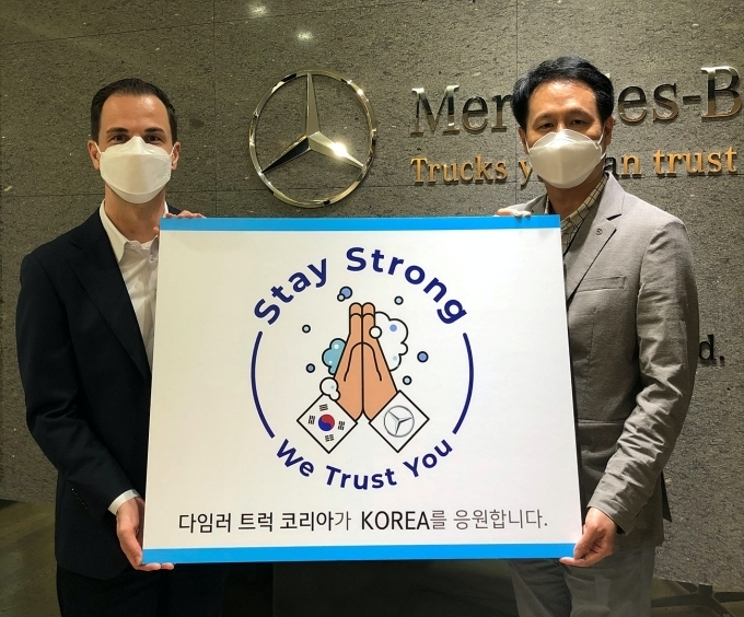 다임러 트럭 코리아 조규상 대표이사는 벤자민 반자프 최고재무책임자와 함께 Stay Strong 캠페인 슬로건과 ‘We Trust You’ ‘다임러 트럭 코리아가 KOREA를 응원합니다’라는 메시지로 코로나19 극복을 위한 응원의 뜻을 전했다.