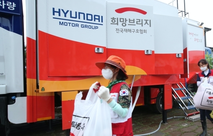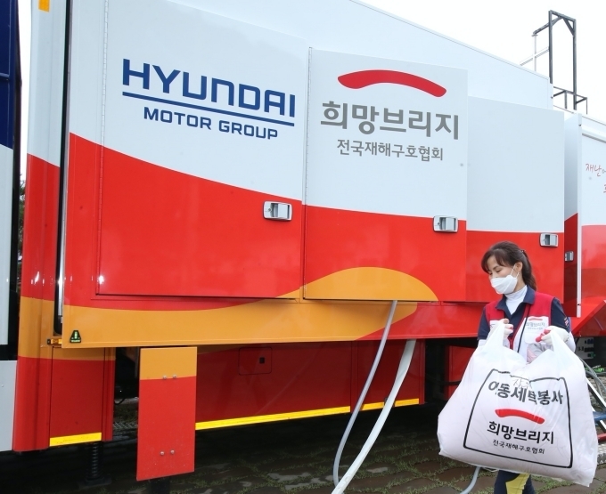 올해 현대차그룹은 희망브리지 전국재해구호협회와 함께 7톤 메가트럭 탑차를 개조한 세탁구호차량을 신규 제작했다. 신형 세탁구호차량은 18kg 세탁기 3대, 23kg 건조기 3대, 발전기 1대가 장착돼 세탁 및 건조를 90분에 완료하고, 하루 평균 1,000㎏ 규모의 세탁물을 처리할 수 있도록 특수 제작됐다.