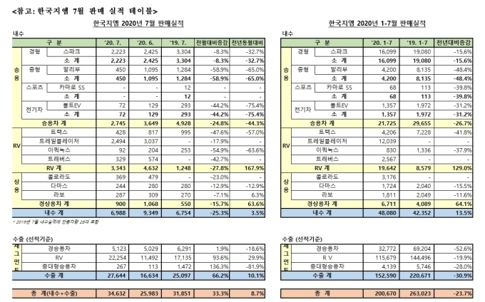 [오토모닝 정영창 기자] 한국지엠이 7월 내수 6988대, 수출 2만7644대 등 총 3만4632대를 판매하며 전년 동월 대비 8.7% 증가했다.