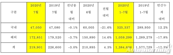 [오토모닝 정영창 기자] 기아차가 2020년 7월 글로벌 시장에서 국내 4만7050대, 해외 17만2851대 등 전년 동기 대비 3.0% 감소한 21만9901대를 판매했다. 이는 지난해 같은 기간과 비교해 국내는 0.1% 감소, 해외는 3.7% 감소한 수치다.