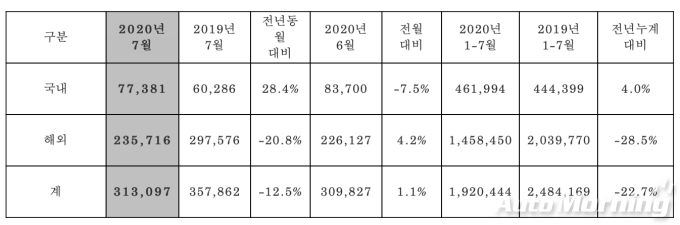 [오토모닝 정영창 기자] 현대자동차는 7월 국내 7만7381대, 해외 23만5716대 등 전 세계 시장에서 총 31만3097대를 판매해 전년동월대비 12.5% 줄었다. 이는 지난해 같은 기간과 비교해 국내 판매는 28.4% 증가, 해외 판매는 20.8% 감소한 수치다.