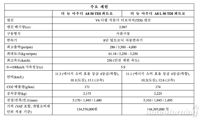 ‘더 뉴 아우디 A8 50 TDI 콰트로’의 가격은 1억3457만6000원, ‘더 뉴 아우디 A8 L 50 TDI 콰트로’의 가격은 1억4439만3000원이다.