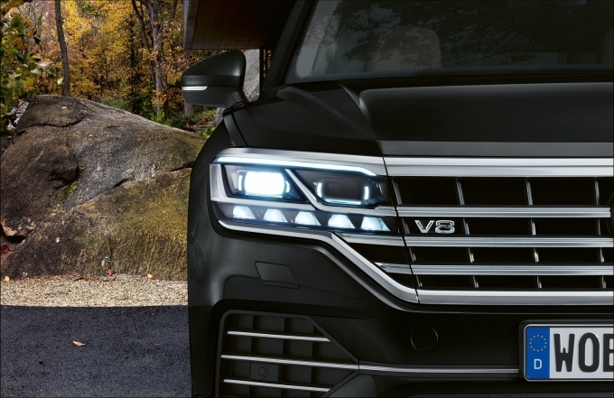 IQ. 라이트 - LED 매트릭스 헤드라이트는 투아렉 V8의 전면부를 더욱 강인하고 세련되게 만드는 디자인적 효과도 동시에 제공한다. 폭스바겐의 디자이너와 엔지니어의 협업을 통해 헤드라이트, 주간주행등, 방향지시등 및 코너링 라이트를 입체적으로 통합시켜 투아렉 특유의 전면 디자인 존재감이 한층 더 높아졌다.