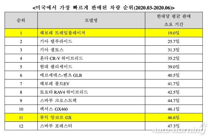아이씨카는 2020년 3월부터 6월까지 북미 시장에 출시 및 판매된 신차(기아 텔루라이드, 기아 셀토스, 혼다 CR-V 하이브리드, 현대 팰리세이드, 벤츠 GLB 등) 12종을 분석, 대리점에 입고된 후 고객 인도 기간을 조사했으며 트레일블레이저는 평균 19일이 소요돼 신차 중 가장 빠르게 판매된 차량으로 선정됐다.
