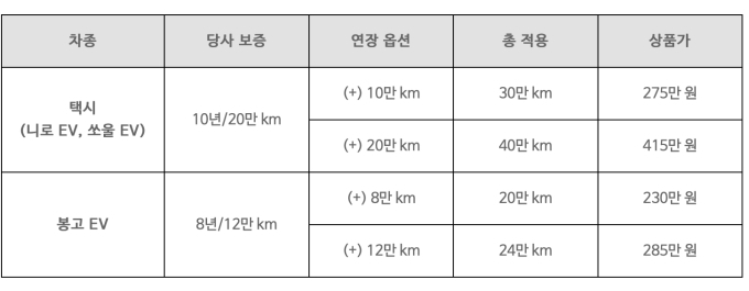 영업용 택시(니로, 쏘울) EV 차량의 경우 당사의 기존 보증 조건인 20만km(보증기간 10년)에 △10만 km를 연장해 총 30만 km까지 보증되는 상품(275만원)과 △20만km를 연장해 총 40만km까지 보증되는 상품(415만원) 두 가지 중 선택 후 가입이 가능하다.