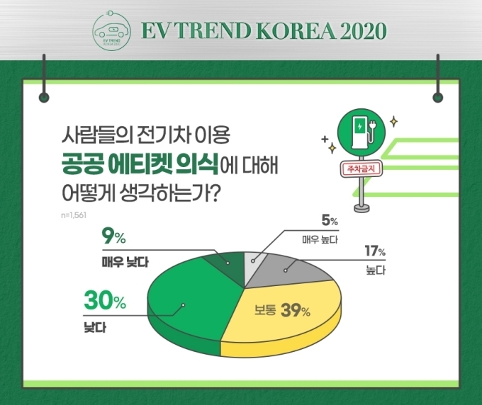 전기차 이용 공공 에티켓 의식을 묻는 질문에 '낮다(30%, 469명)'와 '매우 낮다(9%, 141명)'라고 답변한 사람이 '높다(17%, 269명)'와 '매우 높다(5%, 71명)'라고 답변한 사람보다 많아 시민의식은 개선 필요성을 느끼는 것으로 나타났다.