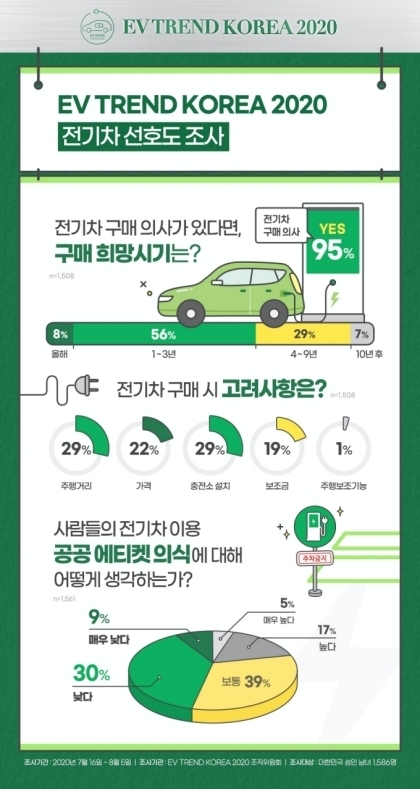 [오토모닝 정영창 기자] 친환경 자동차 전시회 'EV TREND KOREA 2020' 사무국은 지난 7월16일부터 8월5일까지 성인남녀 1586명을 대상으로 전기차 선호도에 대한 설문조사를 실시했다.