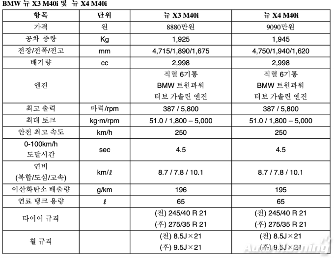 실내에는 M 가죽 스티어링 휠과 스포츠 시트, 하만 카돈 사운드 시스템 등이 기본으로 적용되며 드라이빙 어시스턴트 플러스, 파킹 어시스턴트 플러스와 같은 최신 운전자 보조 시스템도 탑재된다. 가격은 뉴 X3 M40i가 8880만원, X4 M40i가 9090만원이다. 특히 뉴 X3 M40i는 X3에서 처음 선보이는 M 퍼포먼스 모델로 이번 출시로 X3에서 X7까지 다양한 M 퍼포먼스 모델을 경험할 수 있게 됐다.