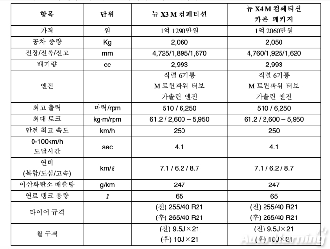 이외에도 편안하고 안전한 주행을 지원하는 드라이빙 어시스턴트 플러스, 파킹 어시스턴트 플러스 등의 기능과 하만 카돈 사운드 시스템, 서라운드 뷰와 같은 편의사양도 탑재된다. 가격은 뉴 X3 M 컴페티션이 1억 1290만원, 뉴 X4 M 컴페티션 카본 패키지가 1억2060만원이다.