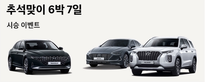 [오토모닝 정영창 기자] 현대자동차는 민족 대명절 추석을 앞두고 총 250대의 귀성 차량을 무상 대여해주는 '추석 맞이 6박7일 렌탈 시승 이벤트'를 실시한다고 4일 밝혔다.