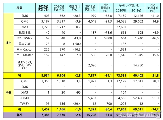 [오토모닝 정영창 기자] 르노삼성자동차는 지난 9월 한 달간 내수 5934대, 수출 1452대 등 총 7386대의 판매 실적을 거뒀다고 5일 밝혔다. 이는 전년동월과 비교해 내수는 24.1%, 수출은 80.4% 각각 줄어 총 51.4% 감소했다.