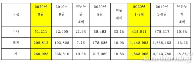 [오토모닝 정영창 기자] 기아자동차가 9월 글로벌 시장에서 국내 5만1211대, 해외 20만8812대 등 전년 동기 대비 10.3% 증가한 26만23대를 판매했다. 이는 지난해 같은 기간과 비교해 국내는 21.9% 증가, 해외는 7.7% 증가한 수치다.