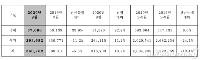 [오토모닝 정영창 기자] 현대자동차는 9월 국내 6만7080대, 해외 29만3682대 등 전세계 시장에서 총 36만762대를 판매했다. 이는 지난해 같은 기간과 비교해 국내 판매는 33.8% 증가, 해외 판매는 11.2% 감소한 수치다.