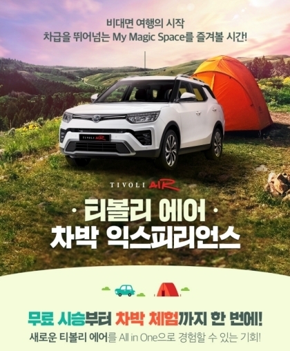 [오토모닝 정영창 기자] 쌍용자동차가 2021 티볼리 에어 출시를 기념해 차박 입문자들을 위한 언택트 차박 시승 이벤트 '티볼리 에어 차박 익스피리언스'를 진행한다고 8일 밝혔다.