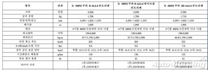 디젤 모델은 쿠퍼 D가 4560만원, 쿠퍼 D 하이트림이 4950만원, 쿠퍼 SD 모델이 5590만원이다. (부가세 포함, 개별소비세 3.5% 인하 적용 가격)