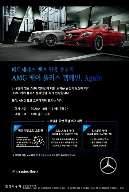 이번 ‘AMG 케어플러스 캠페인’은 한성자동차에서 운영하는 메르세데스-벤츠 인증 중고차 전시장을 통해 메르세데스-AMG 차량을 출고한 고객을 대상으로 진행되며, 지난 8월과 9월 진행된 프로모션에 대한 고객의 관심과 요청에 따라 오는 11월까지 추가 연장한다.