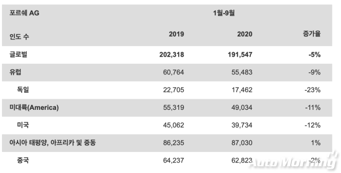 [오토모닝 정영창 기자] 포르쉐 AG가 올해 3분기까지 전년 동기 대비 5% 감소한 총 19만1547대의 차량을 판매한 것으로 집계됐다고 20일 밝혔다.