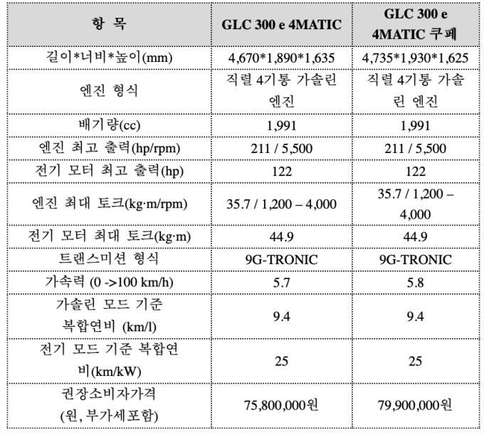 더 뉴 메르세데스-벤츠 GLC 300 e 4MATIC과 더 뉴 메르세데스-벤츠 GLC 300 e 4MATIC 쿠페의 가격은 부가세를 포함해 각각 7580만원, 7990만원이다.