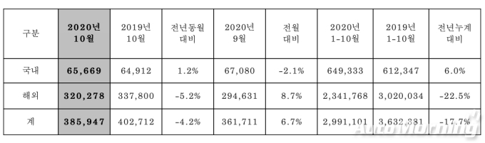 [오토모닝 정영창 기자] 현대자동차는 2020년 10월 국내 6만5669대, 해외 32만278대 등 전세계 시장에서 총 38만5947대를 판매했다고 2일 밝혔다. 이는 지난해 같은 기간과 비교해 국내 판매는 1.2% 증가, 해외 판매는 5.2% 감소한 수치로 전체적으로 4.2% 줄어들었다.