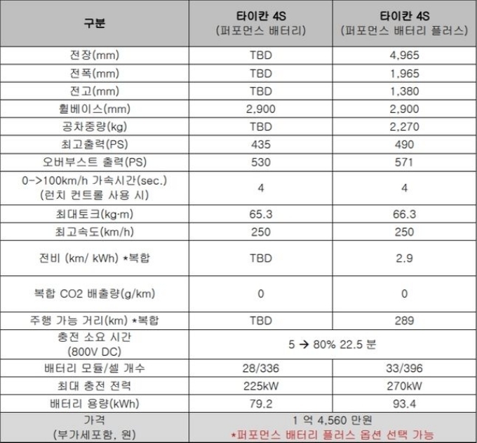 이번에 출시된 ‘타이칸 4S’는 최대 530마력(530PS, 390kW) 퍼포먼스 배터리와 571마력(571PS, 420kW) 퍼포먼스 배터리 플러스를 탑재한 두 개 배터리 용량으로 구성된다.