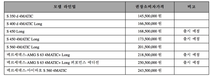 V6 3.0리터 바이터보 가솔린 엔진이 적용된 더 뉴S 450롱 및 S450 4MATIC 롱 모델과 메르세데스-AMG S클래스는 연내 인도를 시작한다는 계획이다. 가격은 1억455만원(S350d 4MATIC)부터 2억4350만원(메르세데스-마이바흐 S560 4MATIC)까지다.