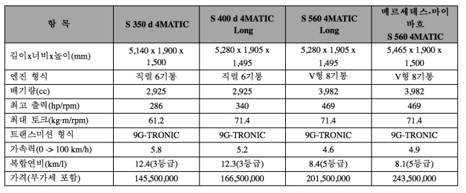 최신 기술의 3.0리터 직렬 6기통 디젤 엔진을 탑재한 S350d 4MATIC과 S400d 4MATIC 롱은 지난 달 말 출고를 시작했으며, 신형 V8 4.0리터 바이터보 가솔린 엔진을 탑재한 S 560 4MATIC 롱, 메르세데스-마이바흐 S560 4MATIC 모델은 17일부터 고객에게 인도된다.