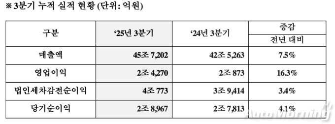 3분기 영업이익은 매출 증가에도 불구하고 관세 영향을 직접적으로 받은 전년 대비 감소세로 돌아섰다. 관세 부담이 가중되면서 주요 사업분야인 모듈 및 핵심부품 제조부문이 적자 전환(-370억원)한 것이 큰 영향을 미쳤다.
