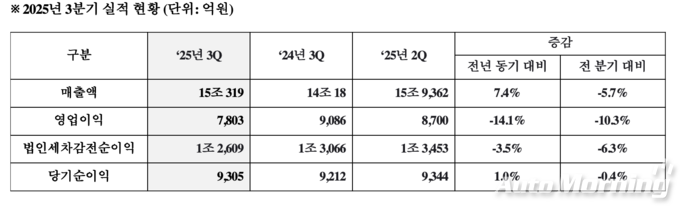 [오토모닝 정영창 기자] 현대모비스는 올해 3분기 연결 기준 영업이익 7803억원, 매출 15조319억원을 거둔 것으로 잠정 집계됐다고 공시했다.