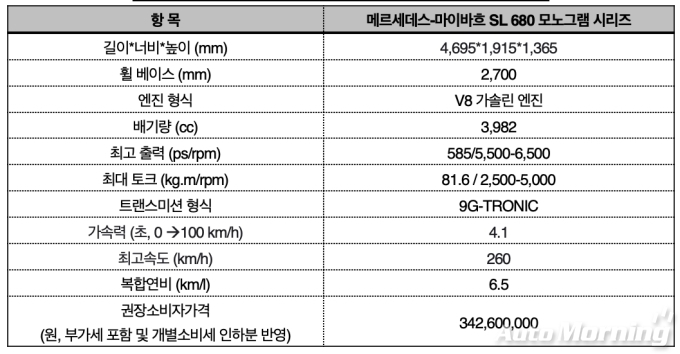 ‘디 올-뉴 메르세데스-마이바흐 SL’은 지난 해 8월 미국 캘리포니아 페블비치에서 전 세계 최초로 공개된 후, 국내에는 지난 7월 서울 강남구에 문을 연 ‘마이바흐 브랜드센터 서울’에서 처음 선보이며 사전 예약을 시작했다. 차량은 이 달부터 고객에게 인도되며, ‘메르세데스-마이바흐 SL 680 모노그램 시리즈’의 레드 앰비언스(Red Ambience)’와 화이트 앰비언스(White Ambience)’ 두 가지 패키지로 제공된다. 가격은 3억4260만원이다(개별소비세 인하분 반영 및 부가세 포함).