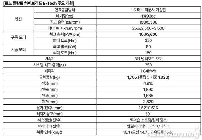 엔진의 최대 토크도 25.5kg.m로 더욱 강력해졌다. 르노 필랑트의 공인 연비는 복합 기준 15.1km/L이며, 1.64kWh의 대용량 리튬이온 배터리를 탑재해 도심 구간 운행 시 최대 75%까지 전기 모드로 주행이 가능하다.