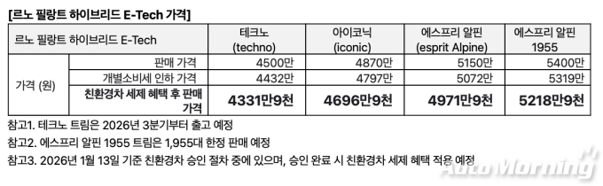 또한 에스프리 알핀 트림에 증강현실 헤드업 디스플레이와 보스® 서라운드 사운드 시스템은 물론, 에스프리 알핀 1955 전용 네임 플레이트, 코트 행거, 태블릿 홀더, 프론트 그릴 데코 등 액세서리를 기본 제공하는 1955대 한정 런칭 에디션인 △에스프리 알핀 1955는 5218만9000원에 선택 가능하다. (단, 르노 필랑트는 2026년 1월 13일 기준 친환경차 정부 승인 절차 중에 있으며, 친환경차 세제 혜택은 승인 완료 시 적용 예정임)
