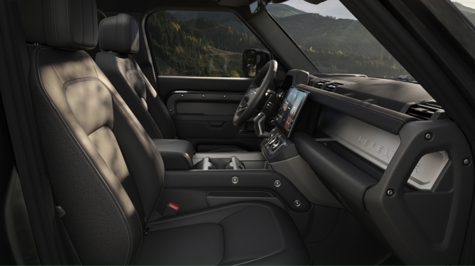 실내는 천공 세미 아닐린 가죽이 적용된 헤드레스트 일체형 퍼포먼스 시트와 메탈릭 그레이 파우더 코트 마감의 크로스 카 빔으로 강인한 개성을 드러낸다. 디펜더 스크립트가 새겨진 조명식 메탈 트레드플레이트가 디테일을 완성한다.