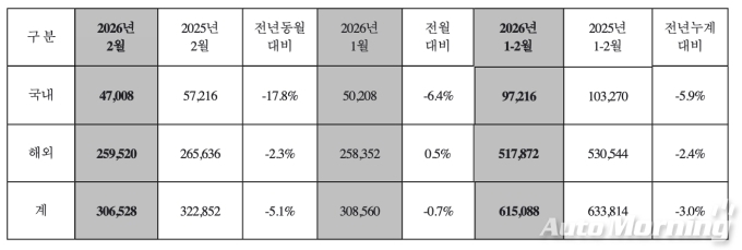[오토모닝 정영창 기자] 현대자동차가 2026년 2월 국내 4만7008대, 해외 25만9520대 등 전 세계 시장에서 전년 동월 대비 5.1% 감소한 총 30만6528대를 판매했다고 3일 밝혔다.