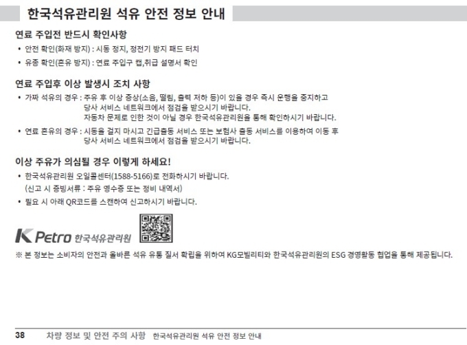 KGM은 협약에 따라 자동차(내연기관) 취급설명서(모바일 앱, 홈페이지 자료, 책자 등)에 △연료 주입 전 운전자 확인 요청 △비정상 연료 주입 후 이상 발생 시 조치 사항 △한국석유관리원 소비자 신고 안내(QR코드 및 오일콜센터 1588-5166) 등 사고 예방 및 위급 상황 발생 시 조치 사항을 새롭게 포함하기로 했다.
