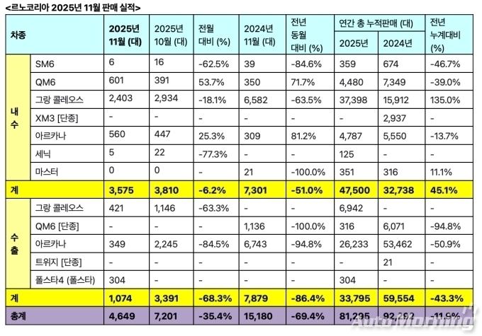 [오토모닝 정영창 기자] 르노코리아가 11월 한 달 동안 내수 3575대, 수출 1074대로 총 4649대를 판매, 작년 같은 기간보다 69.4% 감소했다고 1일 밝혔다.