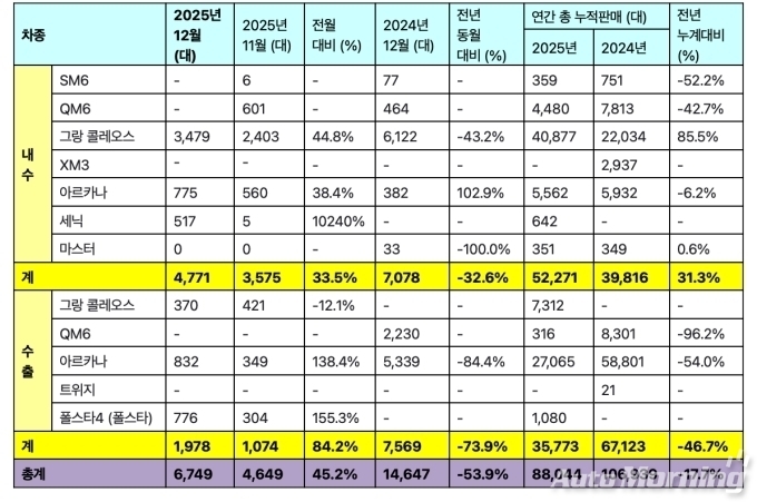 한편 르노코리아는 12월 한 달 동안 내수 4771대, 수출 1978대로 총 6749대의 판매 실적을 거두었다. 지난달 내수 실적은 3479대를 판매한 중형 SUV ‘그랑 콜레오스’가 견인했다.