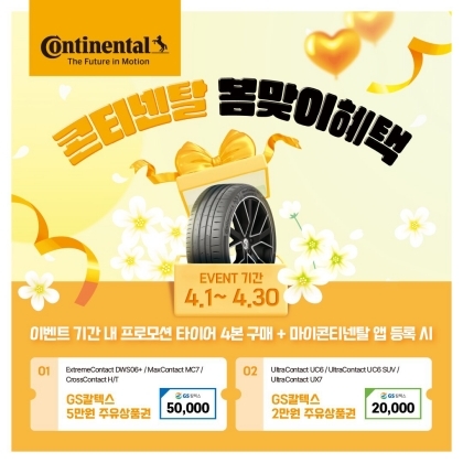 프로모션 대상 타이어는 ‘익스트림콘택트 DWS06 플러스(ExtremeContact DWS06 Plus)’, ‘맥스콘택트 MC7(MaxContact MC7)’, ‘크로스콘택트 HT(CrossContact HT)’로, 해당 제품 구매 시 5만 원권 GS주유상품권이 제공된다. 또한 ‘울트라콘택트 UC6 SUV(UltraContact UC6 SUV)’, ‘울트라콘택트 UX7(UltraContact UX7)’, ‘울트라콘택트 UC6(UltraContact UC6)’ 구매 고객에게는 2만 원권 GS주유상품권이 증정된다. 상품권은 모바일 쿠폰 형태로 발송되며, 5월 13일에 일괄적으로 지급될 예정이다.