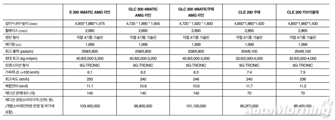 차량 가격은 E300 4MATIC AMG 라인이 1억340만원, GLC 300 4MATIC AMG 라인이 9680만원, GLC 300 4MATIC 쿠페 AMG 라인이 1억110만원, CLE 200 쿠페가 8020만원, CLE 200 카브리올레가 8640만원이다(모두 개별소비세 인하분 반영 및 부가세 포함). E-클래스와 GLC 및 GLC 쿠페 총 3종은 각각 140대, 그리고 CLE 쿠페와 CLE 카브리올레는 각각 70대씩 판매된다.